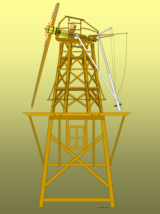 | 1: Achtkantstijl 2: Bezaan 3: Bovenas 4: Bovenwiel 5: Buitenroede 6: Ezel 7: Kleppen en treklat 8: Korte schoor 9: Korte spruit 10: Kruilier 11: Lange schoor 12: Lange spruit 13: Liggers 14: Raam 15: Spin 16: Staander 17: Staartbalk 18: Stellingplanken 19: Stellingschoor 20: Vang 21: Vangbalk 22: Vangstok 23: Windpeluw 24: Zwichtstang 25: Zwichtboom |