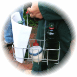 hij meetorst in zo'n draadmandje waar je melkflessen in kunt vervoeren. "Mit draank meer klaank!"
