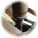 Bé de aangeslagen molensteen in het werk; er kon nog wat veevoer gemalen worden. "Woar