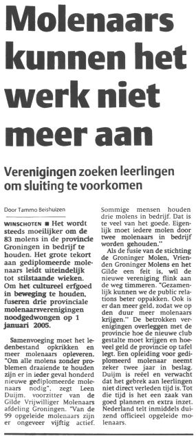 Even fantaseren: hoe zouden we die nieuwe vereniging dan gaan noemen? In deze dotcom tijden is "Groninger Molenvereniging" misschien net even iets te eenvoudig? Alhoewel: het is wel typisch Gronings om de dingen gewoon bij hun naam te noemen. Wie weet! En hopelijk een fris, modern en duidelijk logo, om de herkenbaarheid te bevorderen. Afijn, al met al is dit toch in mijn ogen een positieve ontwikkeling, die naar ik hoop zelfs kan leiden tot het in ere herstellen van de functie van beroepsmolenaar. Een goed Gronings initiatief!