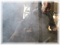 Na ongeveer 50-60 slagen zie je dat de slagbeitel niet meer verder zakt. Je moet het zelf een beetje in de gaten houden, want er zit op de voorslag geen teller. Op de naslagbank trouwens wel. Als de koek geslagen is schort je de slaghei op: als de hei naar boven gaat, trek je aan het schorttouw, doortrekken en het dwarshoutje achter de haken slaan. Nu laat je de koeken nog een tijdje uitwerken: de olie moet de kans krijgen om uit de haren te lopen. Dan los je de loshei: schorttouw een stukje laten zakken, dan voel je de vuist tegen de hei tikken. Dat is het moment dat je het touw rustig laat zakken. Hou het schorttouw van de loshei wel in je handen: zo gauw de boel los ligt moet je de loshei gelijk weer opschorten. Baf, baf, baf.. los... en opschorten maar. De haren worden nu uit de slagbank getrokken. Bij De Wachter hadden we gezien dat de haren open werden gevouwen, maar Doornbos doet het anders: hij trekt ze tussen de gesloten haren uit. Dat doet hij om de warmte in de haren te houden: hoe warmer die blijven des te groter wordt de olieopbrengst. Doornbos vertelde dat je eigenlijk niet na een paar keer slaan weer op moet houden: een oliemolen die juist draait levert maar weinig olie, omdat de haren nog koud zijn en allerhande onderdelen zich nog moeten verzadigen met olie. Is de boel eenmaal op temperatuur dan stijgt de olieproductie plots sterk. Nu de bulen weer uit de haren zijn gehaald volgt het "strupen" - dat heet officieel eigenlijk kaken, maar Doornbos is niet vies van een alternatieve benaming. De bulen worden op de kaak van de warme koek afgestroopt. De koeken worden dan, met wat latjes ertussen om ze uit te kunnen laten wasemen, op hun kant weggezet.