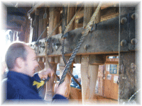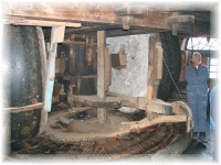 In herhaling schuilt succes, dat bleek maar weer eens: ik herkende nu zonder veel problemen de voornaamste onderdelen en kon die ook benoemen: de kollergang, de strijkers, het doodbed, het vuister en roerijzer, de pan. Dan voorslag- en naslagbank met de slag- en losheien en jaagijzers, de wentelas met de vuisten. De haren en bulen waren ook al oude bekenden en een kaakbank had ik ook al eerder gezien. Woldzigt heeft, zoals de oplettende lezer al had gezien, een voorslag en naslag. De molen heeft verder ook de mogelijkheid om graan te malen, maar daar hebben wij ons deze keer niet mee bezig gehouden. Doornbos, die meer een man van doen dan van theorie is, zette de kollergang in het werk en leerde ons hoe wij het zaad onder de malende stenen moesten strooien. Doornbos spreekt Westerketiers - het Groninger dialect wat in de zuidwesthoek van Groningen wordt gebezigd. Deze variant op de Groninger taal kent Drentse en Friese invloeden en is wat zachter en zangeriger dan het harde Gronings wat in mijn streek gesproken wordt. Een plezier om naar te luisteren - en die kans kregen we volop, want Doornbos had veel te vertellen over zijn molen. Vooral - voorzichtig zijn. "Hannen in e buus!". Inderdaad, als je je vingers onder een steen of hei krijgt ben je ze vrijwel zeker kwijt. Het voeren van de stenen is een niet geheel risicovrij werkje, waar je je verstand goed bij moet houden. Daarom worden normaal gesproken ook geen bezoekers in dit deel van de molen toegelaten: te veel kans op ongelukken. | |||