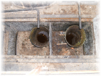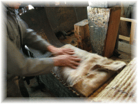 Toen het meel gereed was, liet Doornbos ons de pan over de karen trekken. Zo komt het meel - hopelijk gelijkmatig verdeeld - in de bulen. De lezer die zich nu vertwijfeld afvraagt wat hier in hemelsnaam bedoeld werd raadt ik aan om het verslag van ons bezoek aan De Wachter er nog eens op na te lezen. De bulen werden vervolgens van de haken gehaald en in de karen gezet om te kijken of ze allebei ongeveer even vol waren. Dat lukte ons natuurlijk niet goed - het is een slag - en dus sjoemelden wij een beetje: een paar handen vol meel verhuisden dan van de ene naar de andere buul. Toen de bulen naar tevredenheid gevuld waren werden de haren uit de slagbank getrokken en legden wij de hete bulen er tussen.