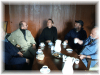 Ik stond nog bewonderend naar de molen te kijken toen Cor Kosmeijer ook aan kwam rijden. Doornbos had hem gevraagd die dag te willen assisteren: er werden naast de GP cursisten nog meer MIO's verwacht en dan is het voor één man geen doen. Wij naar binnen. Hee, wat stond daar op het tafeltje bij de ingang? .. een pan. Mja, wat zou daar inzitten - even kijken. Ahaaaah! Dat was ook zo, Alie had ons verleden week beloofd dat ze een pan originele Grunneger snert zou koken - van het soort waar je lepel rechtop in kan staan en waar bijkans een half varken inzit, met haar en al - en zo te zien had ze woord gehouden. Dat beloofde wat voor het middagmaal! Maar goed, waar zaten die Groote Poldermolenaars? Ik hoorde vaag gerumoer van stemmen, ergens boven in de molen. Ze zouden wel op de stelling staan en helpen bij het opzeilen, vermoedde ik. | |||