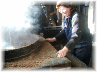 Ondertussen was de wind verder aardig aangetrokken en de kantstenen draaien nijver in het rond. Zo ontstond een soort trage estafette rond ligger en doodsbed, met MIO's die achter elkaar aandraafden, elkaar het spintvat met lijnzaad of het watervaatje aanreikten en waarschuwende kreten uitstootten: "Kiek oet! Hest ligger in rogge!" of "Deurlopen wicht hor! Kantstain holt die in!" etc.. Er is in deze molen ook nog relatief weinig ruimte: kollergang, slagbanken en vuisters staan er heel dicht op elkaar - dus moet je duvels goed uitkijken wat je doet. Doornbos hield het allemaal goed in de gaten en waakte ervoor dat we niet al te jolig werden. Nadat de stenen gevoerd waren konden we een tijdje kijken hoe het zaad gekneusd werd. De strijkers strijken het gekneusde zaad steeds weer onder de stenen, die elk in een eigen spoor lopen: je hebt een binnensteen en een buitensteen. Het meel plakt aan de kantstenen vast en wordt daar middels op de steen lopende schrapers weer afgeschraapt. Na verloop van tijd is het meel klaar. Dan wordt de kuipschuif geopend en vervolgens wordt de afloopbak neergelaten. Deze schuift het meel nu van de ligger af en via de kuipschuif in de klaarstaande meelbak. De volle meelbak wordt dan bij het vuister gezet: het meel moet namelijk worden verwarmd. Net zoals op De Wachter heeft Woldzigt een pan zonder bodem.