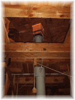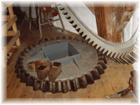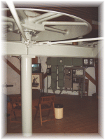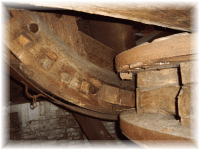 Via een nog wat gammeler trapje kwam ik tenslotte in de kap terecht. Sjonge, dat was wel een grote kap.. en een bijhorende groot bovenwiel met, als ik het goed zag, een vlaamse bandvang. Bijzonder: er zit een houten bovenas in de molen. Ook opvallend: een rollen-kruiwerk. Zou deze molen ooit zelfkruiend zijn geweest? Ook viel me op dat de kap rust op een soort draagstoel: een constructie van balken, die zeker een meter onder de rolvloer en om de koningsspil heenloopt.
