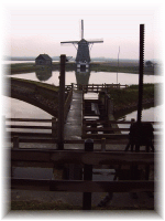De molen heeft, net als de GP, een Oud Hollands gevlucht (hekwerk met zeilen). Maar anders dan op de GP heeft deze molen fokwieken (Fauel-wieken) en steekborden op beide roeden. Een fokwiek (de naam "Fauel" is die van de ingenieur die ze heeft bedacht) heeft in plaats van windborden een hol, gebogen houten profiel wat achter de roede eindigt, met een spleet tussen roede en profiel. Het profiel is hol aan de voorkant en bol aan de achterkant: de holle kant is een uitstekende windvanger. De wind wordt dan vervolgens via de spleet tussen roede en fokwiek achter het hekwerk geleid, waardoor extra onderdruk achter het zeil ontstaat wat de trekkracht nog meer vergroot. De bolle, naar het molenhuis gerichtte kant levert een goede stroomlijn op. De totale trekkracht van dit systeem is zeer groot. Deze molen moet, met zijn enorme vlucht, zijn gunstige ligging en de fokwieken, op heel veel dagen kunnen malen. Ik zou graag in de molen zijn geweest - zo zijn er op de begane grond in de veldmuren ramen te zien, die doen vermoeden dat er een huiskamer en keuken te bezichtigen zijn, misschien wel een bedstee. De molen heeft in plaats van een vijzel een tweetal schroefpompen (vroeger waren dat er 3 maar 1 ervan werkt niet meer) en dat had ik ook wel graag eens bekeken. Maar zoals gezegd: het bleef bij foto's maken vanaf de dijk. Maar ik ga er zeker nog eens heen en maak dan van te voren met de molenaar een afspraak om de boel eens goed te kunnen bezichtigen. |