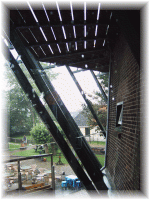 De uitbater van het restaurant was er niet, maar zijn schoonvader ontving ons vriendelijk en toen ik vertelde dat ik molenaar was slofte hij naar binnen om de sleutel te zoeken. Ik mocht best even kijken, maar, zo waarschuwde hij: pas op en het is voor eigen risico. Dat klonk niet veelbelovend. En zo bleek het ook. Bij mijn eerste rondgang buiten de molen bleek me al dat de molen niet meer bruikbaar is, althans: vanuit de optiek van een molenaar. Het gevlucht doet gammel aan, de heklatten liggen los en zien er niet best meer uit, de windborden lijken pietepeuterig ten opzichte van de rest van het gevlucht en zien er ook al niet best uit. Een roedeketting of iets dergelijks zag ik niet: bij stormweer, zo vertelde schoonvader, kwam de brandweer om het wiekenkruis te borgen en te voorkomen dat de molen op hol sloeg. Kruien gaat al lange tijd niet meer, ik zag dat de lange schoren tegen de torenmuren klem zaten en de kruilier was defect. De torenmuur was wel hersteld, je kon nog duidelijk zien waar ooit een enorm gat gezeten moet hebben, maar al met al moest ik mijn eerste indruk wat bijstellen.
